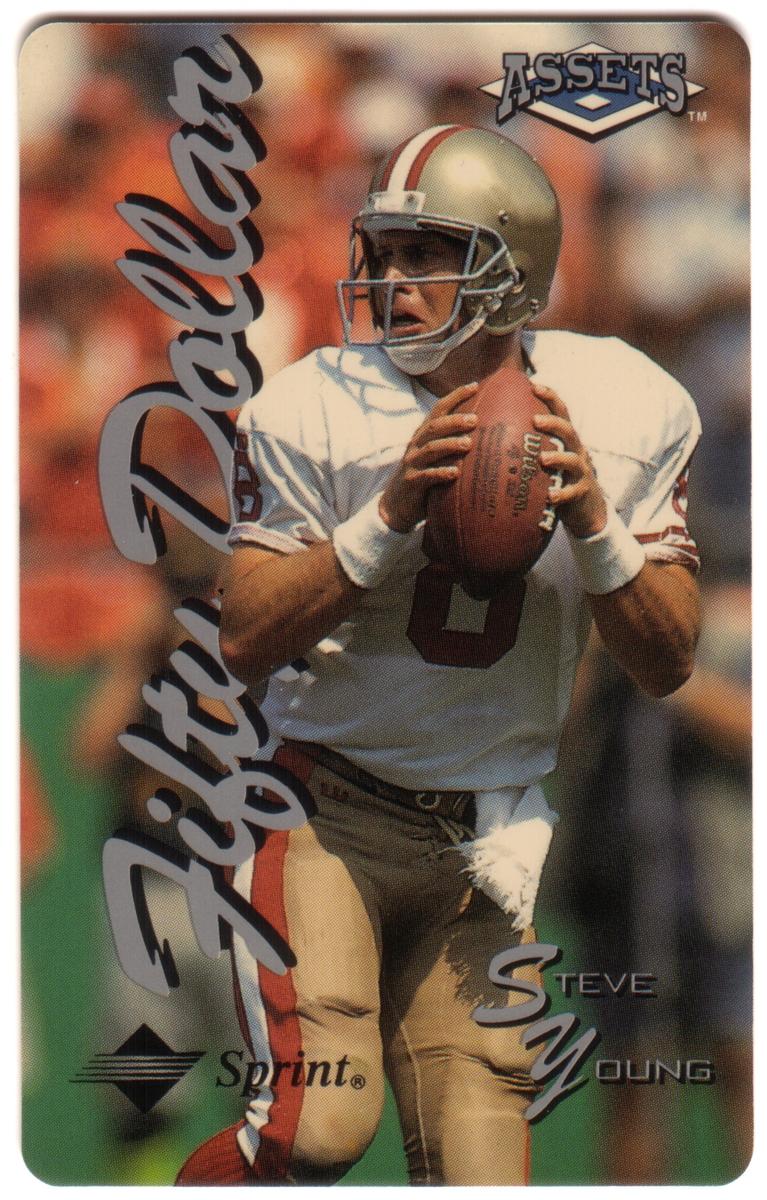 This collectible phone card features a photographic image of Steve Young, the quarterback for the San Francisco 49ers NFL team. He is in a game setting, wearing the 49ers' white jersey with red and gold accents, holding a football in both hands as if preparing to throw a pass. Young's helmet is gold with a red stripe down the middle.