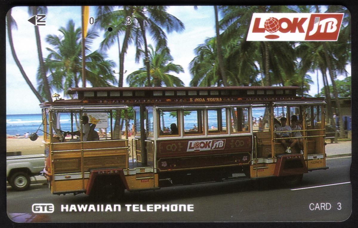 Text on the card includes the GTE Hawaiian Telephone logo, reinforcing its origin, and the card’s associative branding with Hawaiian travel and transportation. This collectible combines iconic island imagery with a functional streetcar scene, capturing a slice of Hawaiian everyday life and tourist experience.
