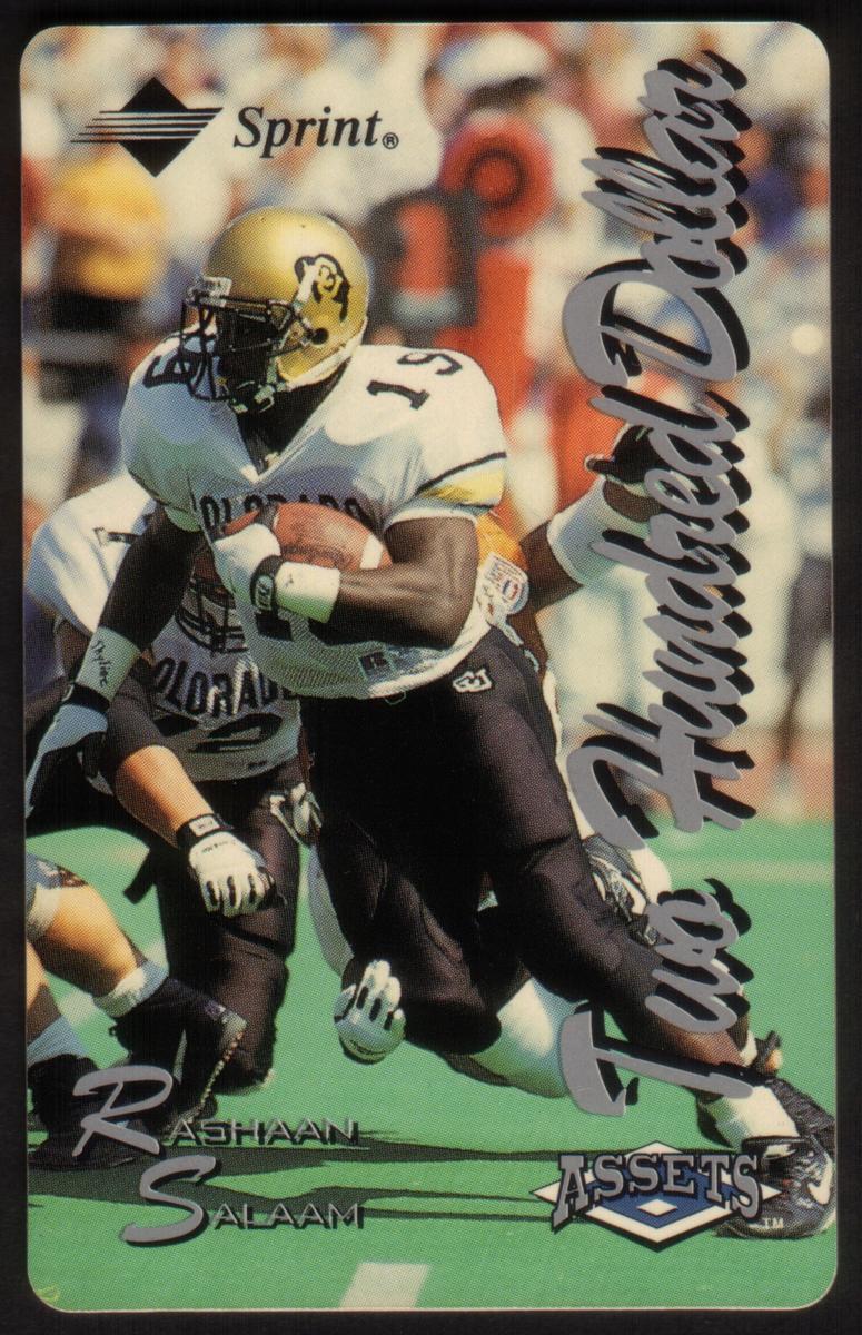 This collectible phone card features an action photograph of Rashaan Salaam, a football player for the University of Colorado Buffaloes. Salaam is shown in full game uniform, wearing a gold helmet with the Buffaloes logo on the side, a white jersey with "COLORADO" written across the chest, and black football pants. He carries the football securely under his right arm while running on a green field, preparing to evade opposing players during a play. The photograph captures dynamic movement and intensity typical of a live football game.