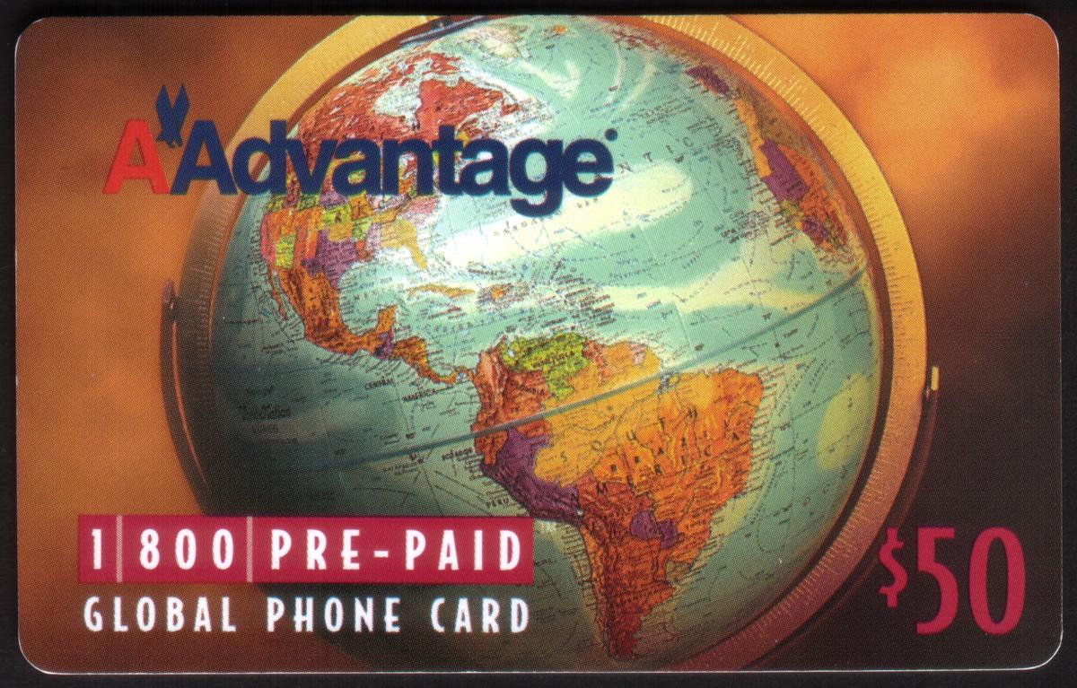 This phone card combines themes of aviation, travel, and telecommunications under the American Airlines AAdvantage brand, suitable for prepaid global phone use. It is marked with trademarks related to airlines and aircraft, emphasizing its connection to air travel and transportation.