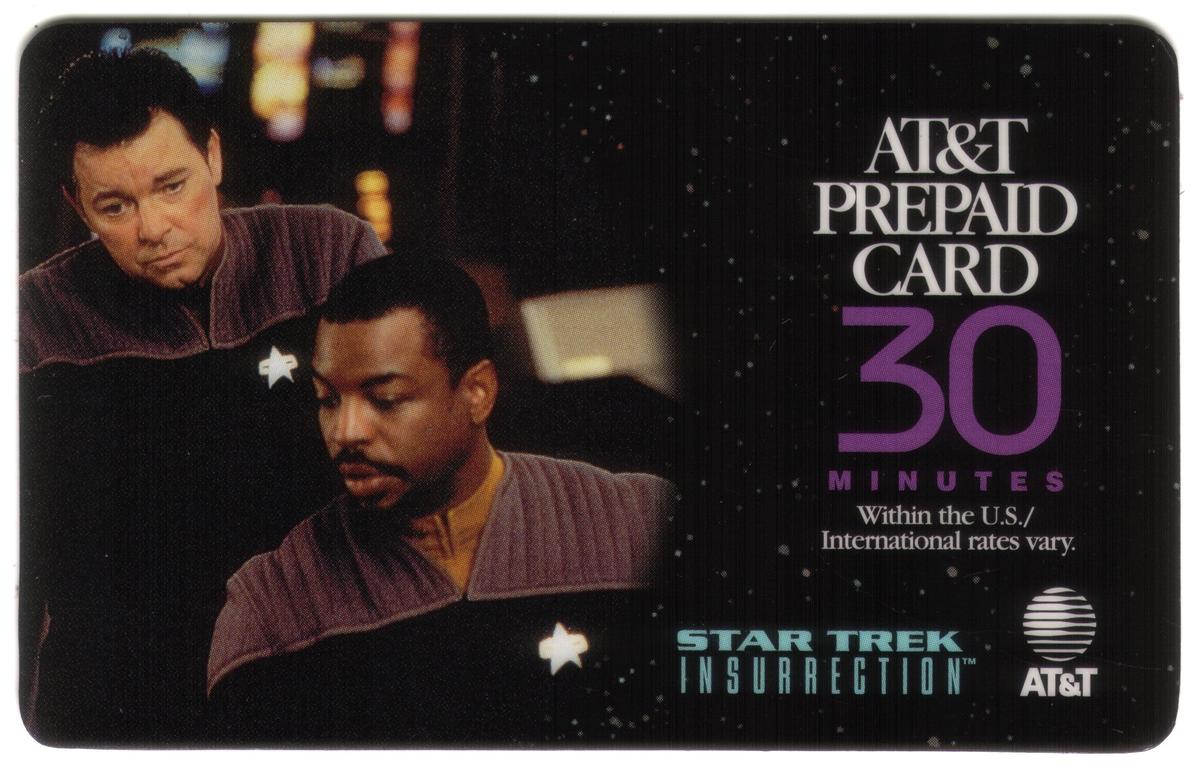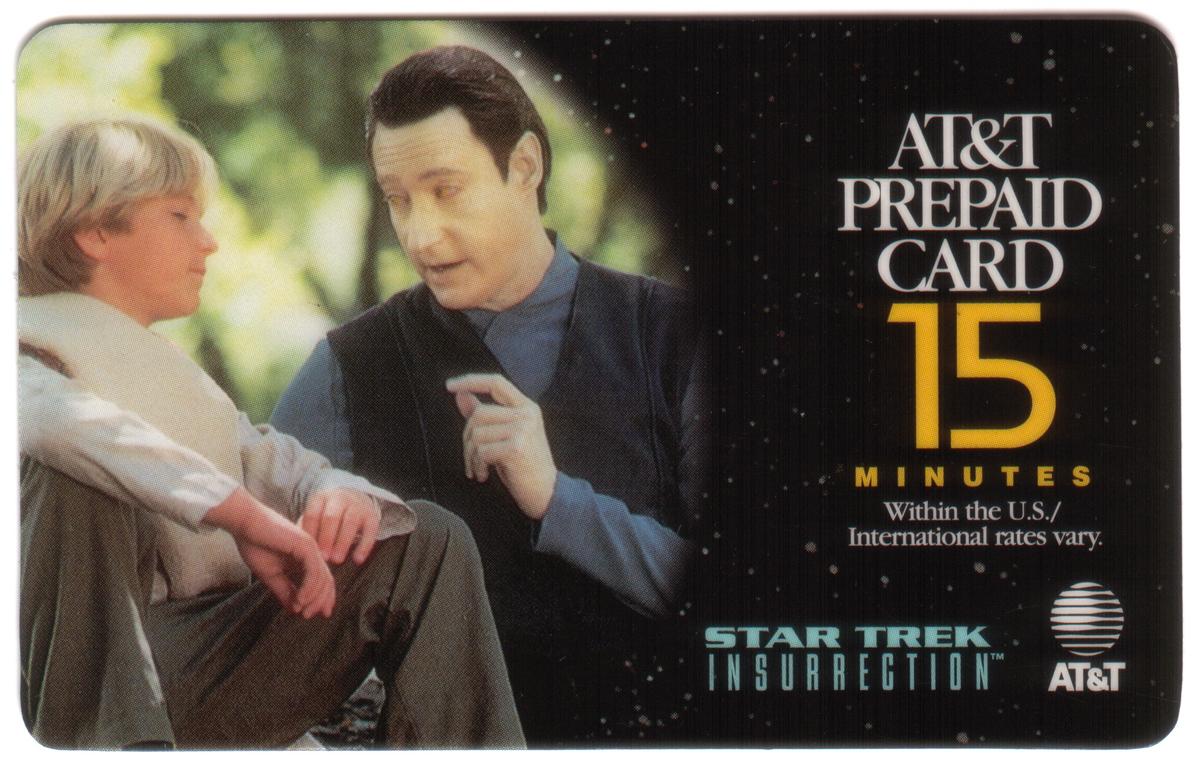 Set of four 1998 Star Trek: Insurrection themed AT&T prepaid cards featuring Data, Geordi, Romulans, and Ru’afo with 15 to 100 minutes of calling time. |