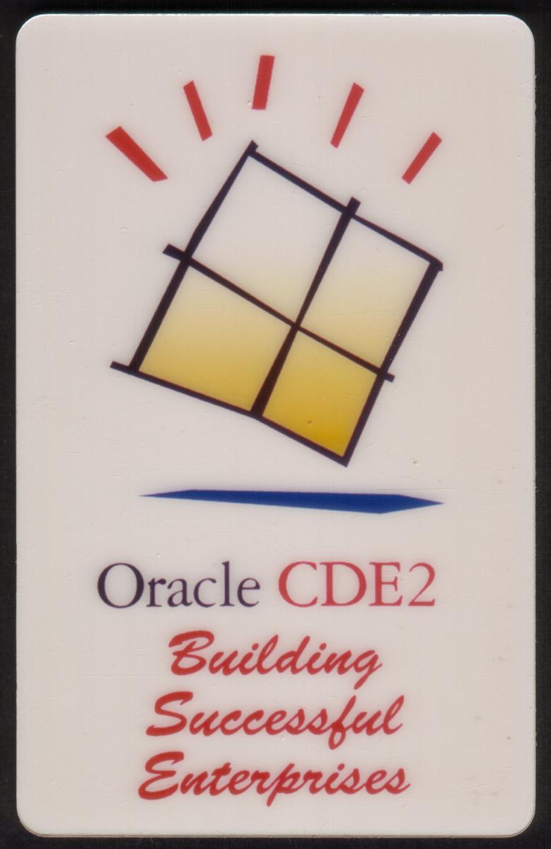 This collectible card features the Oracle CDE2 logo prominently in the center. The logo consists of a tilted square divided into four smaller sections with a gradient color scheme transitioning from yellow at the bottom to white at the top. Surrounding the top of the square are six red rays, resembling light beams, emphasizing the logo’s presence. Beneath the square is a blue, elongated horizontal shape.