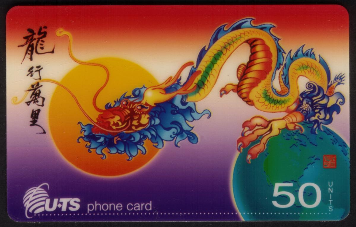 This collectible phone card features artistic imagery connecting Chinese cultural elements with a global theme. The central visual includes a stylized dragon, a traditional symbol in Chinese culture, positioned prominently as if watching over a globe representing Earth. Bright colors highlight the dragon’s details, showcasing scales and claws in a dynamic pose. Adjacent to the globe, an image of the sun appears, emphasizing the card’s theme of protection and oversight.