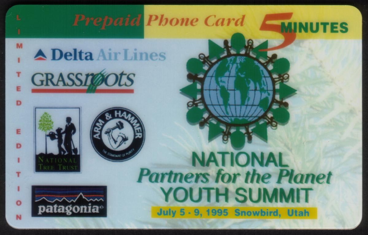 This collectible Delta Air Lines phone card features a design commemorating the National Partners for the Planet Youth Summit held in 1995 at Snowbird, Utah. The front of the card prominently displays logos and names of several environmental and youth organizations collaborating for the event, including Grassroots, Arm & Hammer, Patagonia, National Tree Trust, Tree Musketeers, UT Forest Council, Arbor Club, YMCA Earth Services Corps, KOPE, Natural Guard, Tree Amigos, and LDDS WorldCom. The Earth globe graphic is central to the design, reinforcing the environmental focus of the summit.