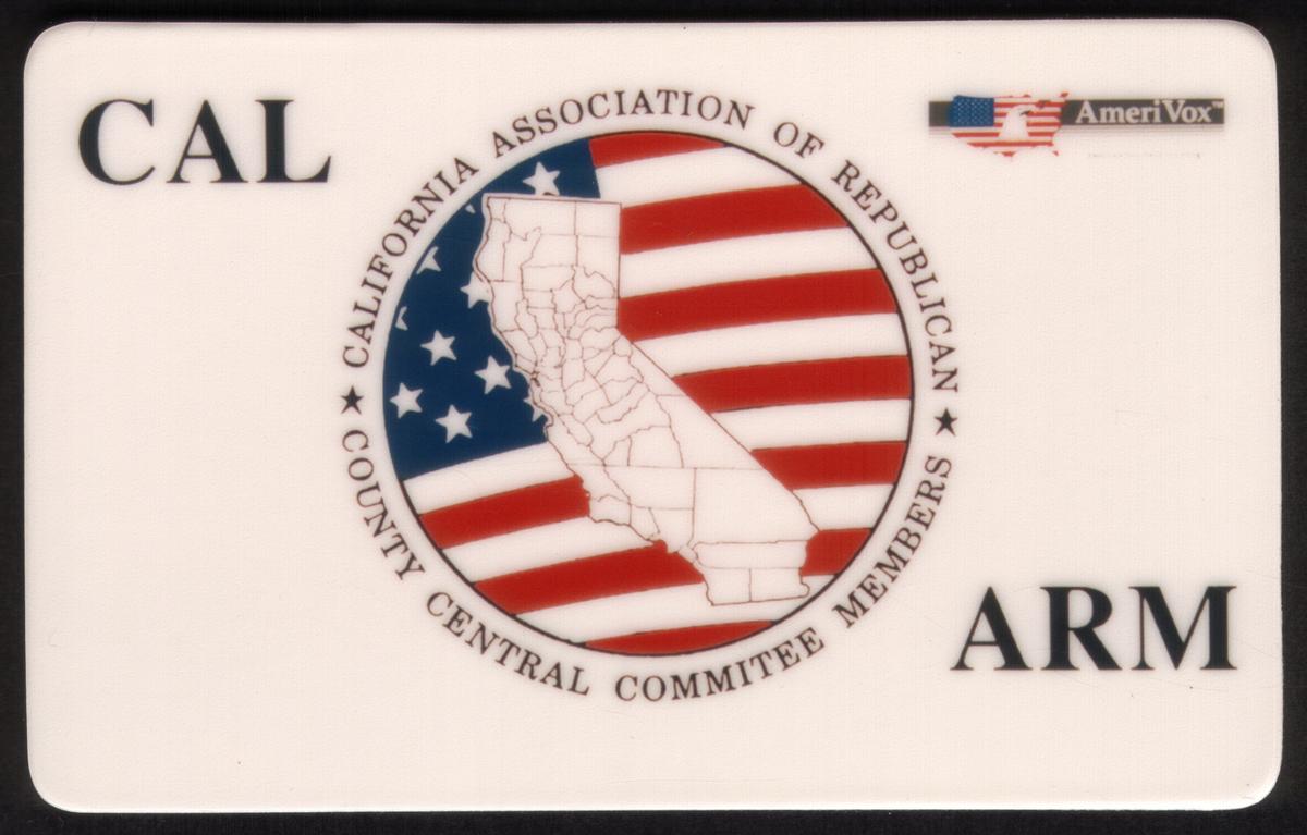 This collectible card features the logo of the California Association of Republican County Central Committee Members. The logo consists of a circular design with the outline of the state of California filled in white, set against a background of the American flag’s stars and stripes. Surrounding the logo is the text: "CALIFORNIA ASSOCIATION OF REPUBLICAN COUNTY CENTRAL COMMITTEE MEMBERS" in uppercase letters.
