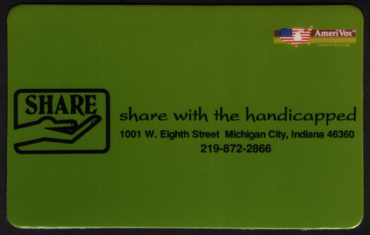 Overall, the card reflects its purpose as a fundraising and awareness item for the Share With The Handicapped organization, emphasizing contact information and partnership with AmeriVox. The design is straightforward and informative, focusing on the foundation’s mission and location.