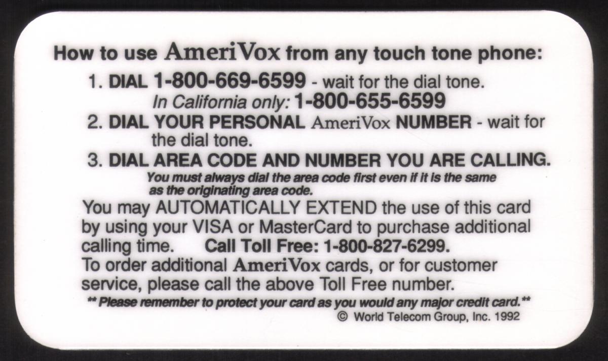 In the bottom right corner, there is a small logo combining the American flag with the text "AmeriVox," indicating the company associated with the card. The card has a predominantly white background with rounded corners and no other visible graphics, text, or imagery on the front.