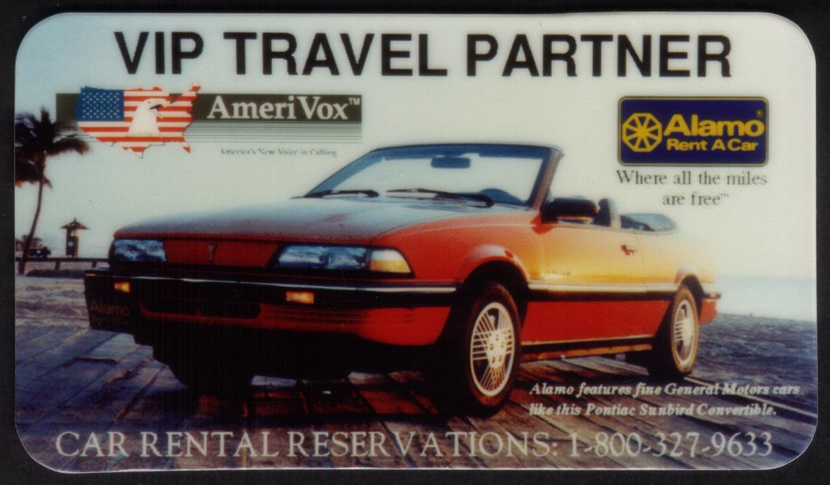 The top of the card displays the text "VIP TRAVEL PARTNER" in bold black letters. Below that, on the left side, is an AmeriVox logo featuring a stylized red map of the United States with a small American flag and the tagline "Bringing You Voice in Calling." On the right side, the Alamo Rent A Car logo appears in yellow and blue, accompanied by the phrase "Where all the miles are freeĀ®."