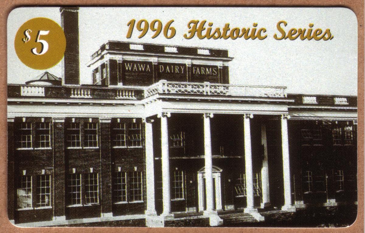 This collectible phone card features a historic image of the Wawa Dairy Farms Building, part of the 1996 Historic Series. The card highlights a classic representation of the Wawa Dairy Farms Building, showing the structure with clear architectural details. This image is set against a clean, neutral background, emphasizing the building's design and significance.