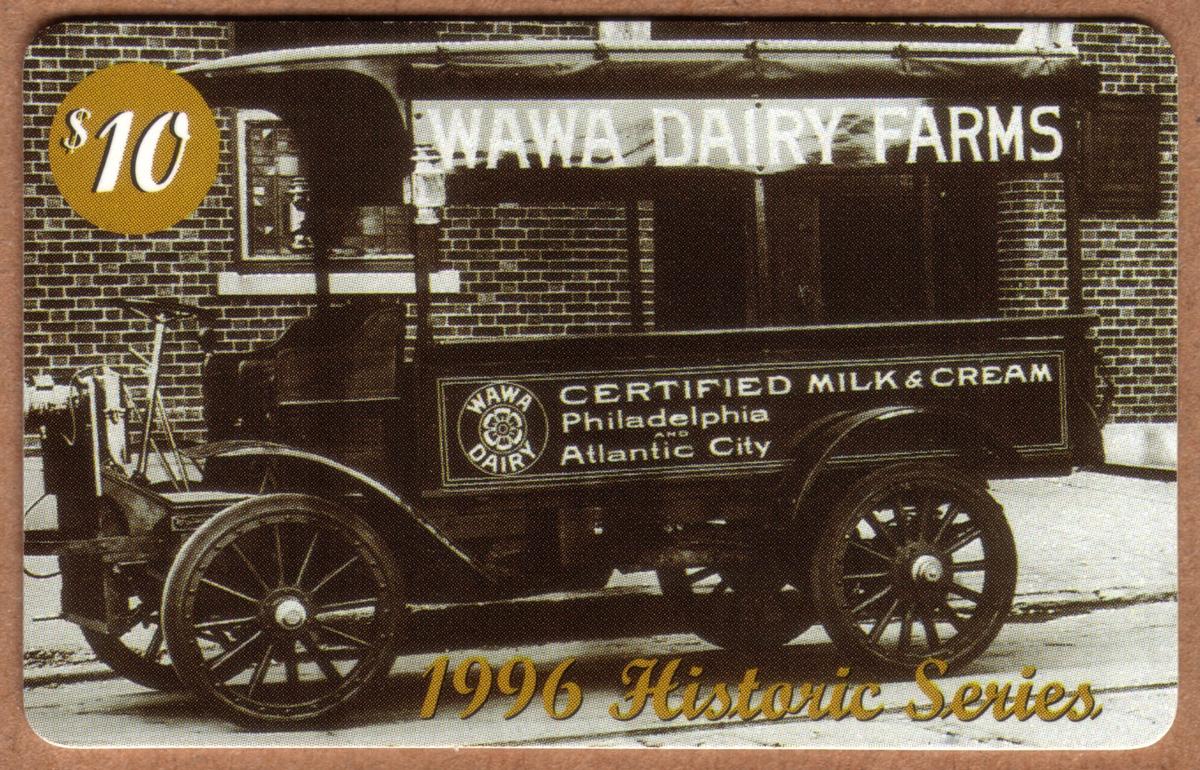 This collectible phone card from 1996 is part of the Historic Series and features the Historic Wawa Dairy Farms Truck. The card highlights a detailed image of a classic milk delivery truck associated with Wawa Dairy Farms, showcasing its vintage style. The truck is presented prominently in the center, with clear branding visible that ties it to Philadelphia DNA and Atlantic City, reflecting the card’s regional connections.