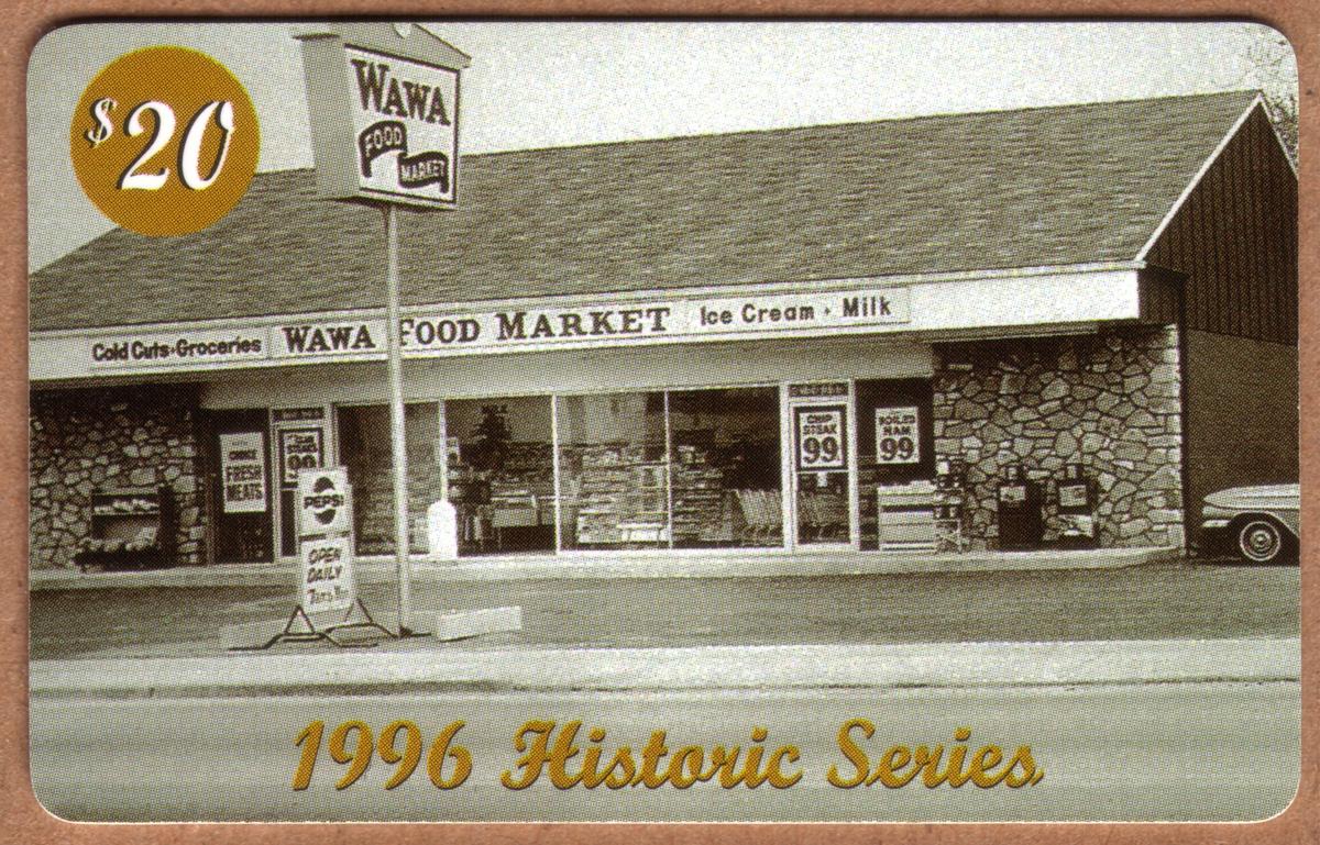 This collectible phone card features a detailed image of the Historic Wawa Convenience Store as part of the 1996 Historic Series. The card prominently displays the Wawa store front, including the store signage and surrounding exterior, reflecting a moment in time capturing everyday retail life. The design incorporates branding elements including the Wawa logo and a depiction of the convenience store’s facade.