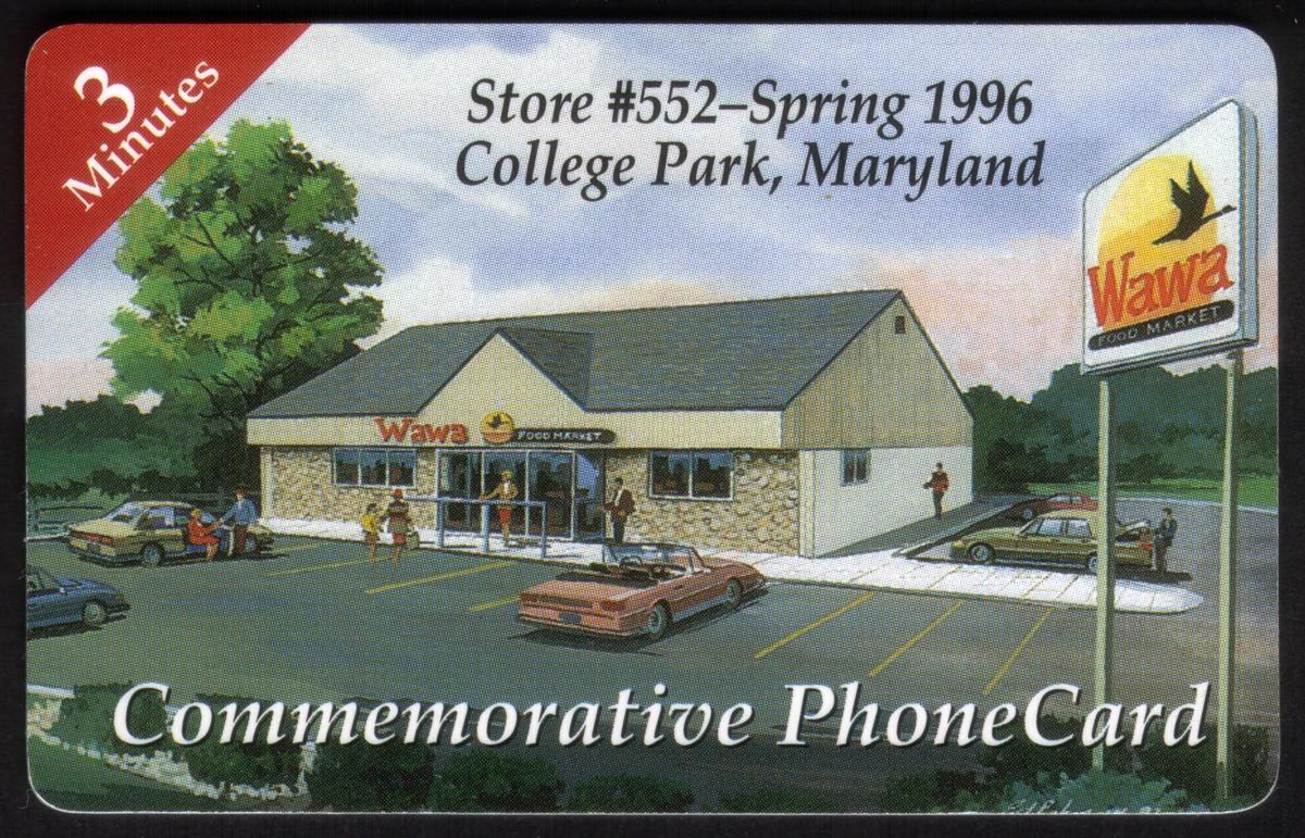 This card combines corporate branding with a promotional element highlighting Wawa's new store location, making it a collectible item connected to telecommunications and retail establishments in College Park, Maryland.