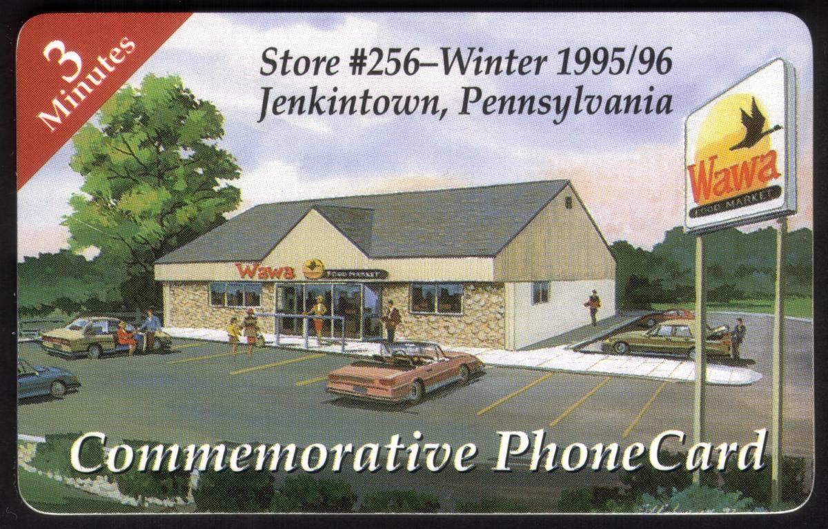 Overall, the card’s front side centers on promoting the opening of the Wawa Food Market store in Jenkintown, Pennsylvania, alongside references to telecommunications networks, making it a distinct collectible that ties regional retail and communications themes.