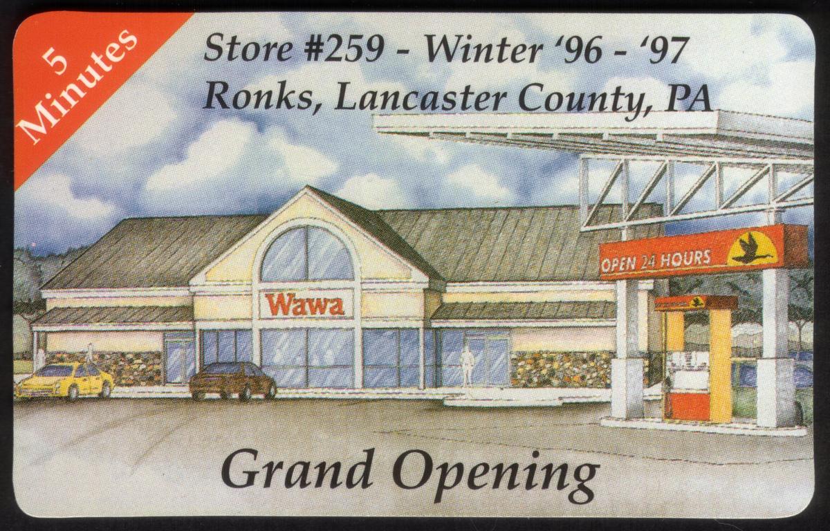 This collectible phone card features a vibrant image related to the Wawa Food Market, highlighting the grand opening of Store #259 located in Ronks, Lancaster County, Pennsylvania. The card’s design includes a clear depiction of a gas pump and signage indicating the 24-hour access to services. The text prominently displays "Networks Around the World" and "Access Telecom ASC," emphasizing the card’s telecommunications affiliation.