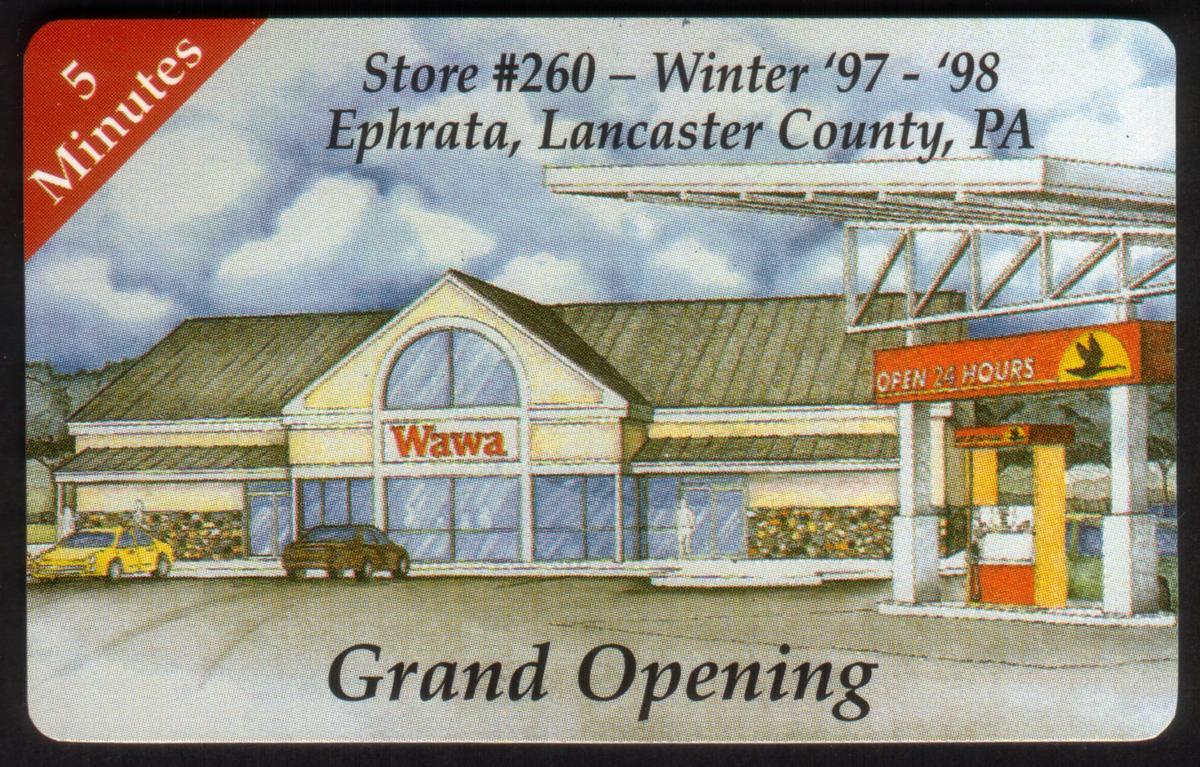The card references Pennsylvania, specifically the grand opening of a Wawa Food Market store, identified as Store #260 located in Ephrata, Lancaster County, PA. The Wawa logo is present, linking it to this regional convenience store chain. Additionally, "NATW 5m" appears on the card, denoting a 5-meter calling credit.