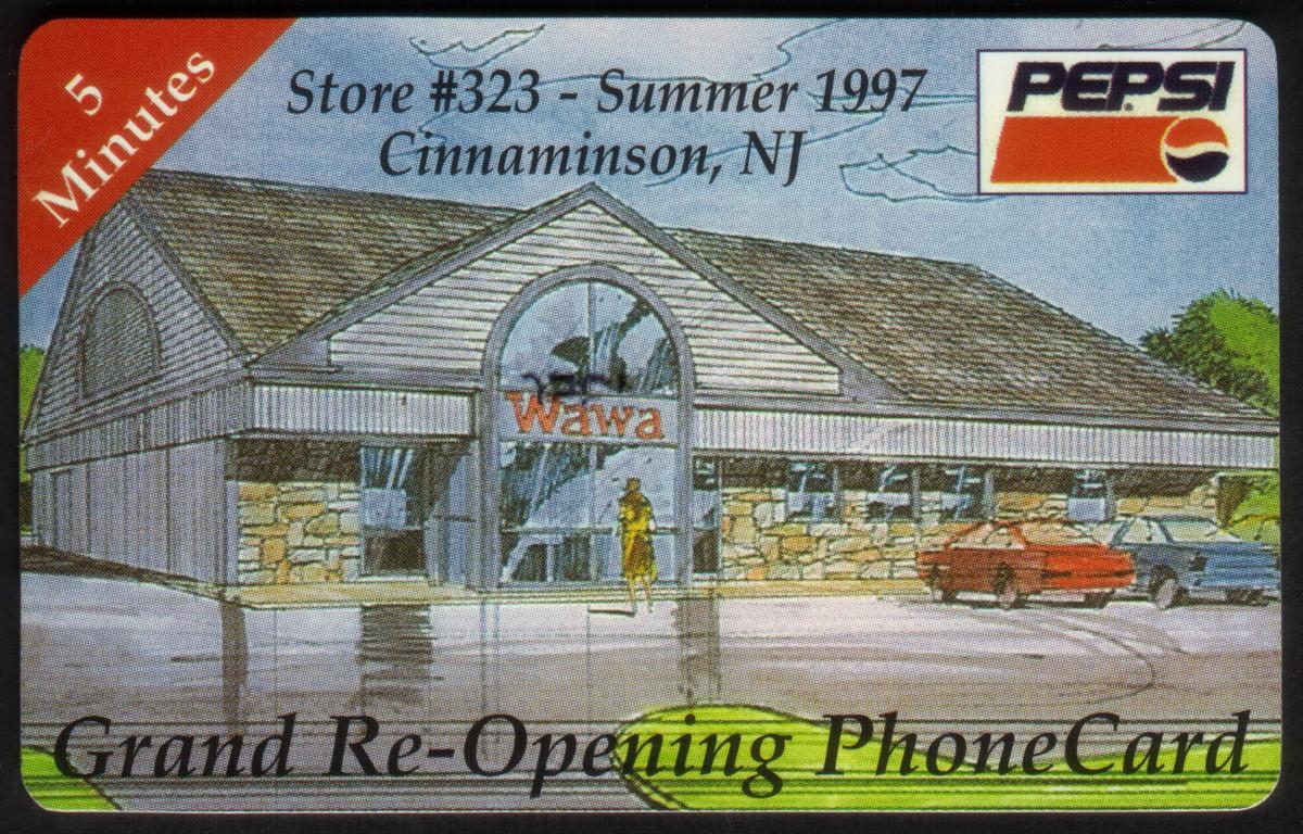 This card is a collectible phone card issued in connection with a special event, highlighting a key commercial reopening while showcasing brand cooperation among Wawa, Pepsi, and Access Telecom ASC. The card’s front design is focused on branding and event information without additional imagery or artwork.