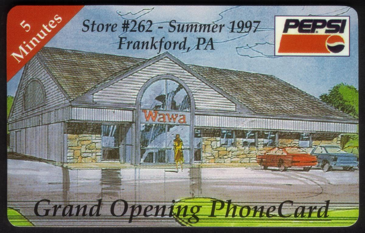 This collectible phone card features the branding of Networks Around The World and Access Telecom ASC. The design celebrates the grand opening of the NATW 5M Wawa Food Market New Store #262 located in Frankford, Pennsylvania. The card prominently includes the Pepsi logo, linking it to the store opening event and its associated promotions. The layout integrates text elements such as "networks around the world" and "Access Telecom ASC" clearly displayed, emphasizing the telecommunications and connectivity themes.