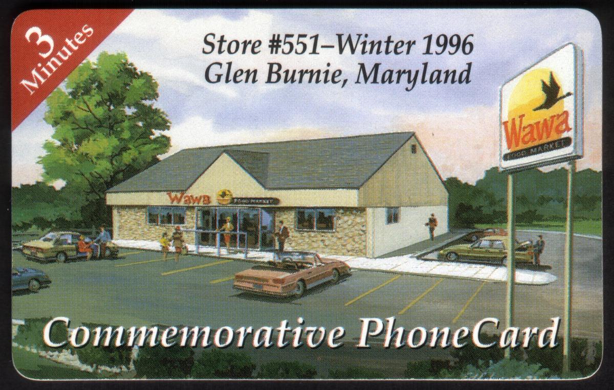 The phone card includes the "WorldCom" name on the bottom left portion of the design, signifying the telecommunications entity connected to the card. The overall layout and graphic elements emphasize telecommunications networks and the launch of a specific Wawa Food Market location in Glen Burnie, Maryland, aligning with the card’s theme of global connectivity and access.