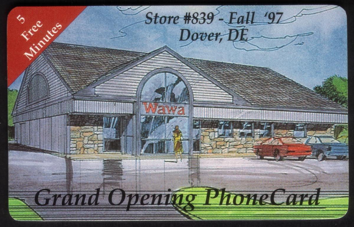 This collectible phone card commemorates the grand opening of the Wawa Food Market Store #839 located in Dover, Delaware. The card prominently features the phrase "NATW 5 Free Minutes," indicating it offers five complimentary calling minutes. The design includes the Wawa logo alongside references to "Networks Around the World" and "Access Telecom ASC," highlighting telecommunications connectivity themes.