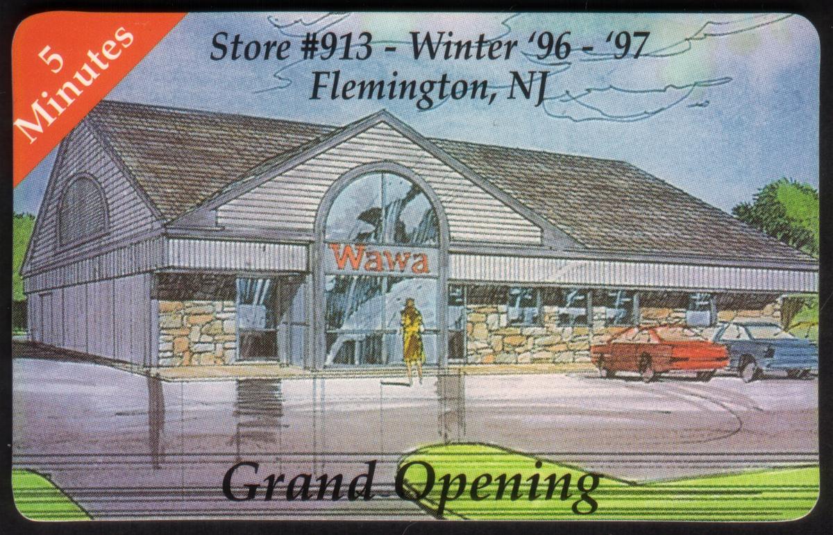 The main design area includes a vibrant, clear image of the Wawa logo accompanied by the phrase "Wawa New Store: #913 Flemington New Jersey," directly referencing the location and store number. The card’s color scheme includes a mix of dark blue and red backgrounds subdivided into geometric shapes, framing the central text and logos. The words "Networks Around World" appear again near the lower left corner, reinforcing the theme.