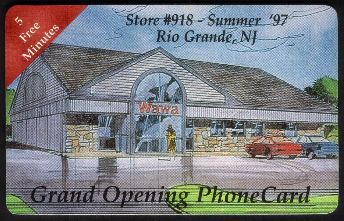 Overall, this phone card celebrates the launch of a new Wawa market location in Rio Grande, New Jersey, providing prepaid calling minutes and showcasing partnerships among multiple telecom networks. The clear and precise branding makes it a noteworthy collectible for phone card enthusiasts and those interested in telecommunications milestones.