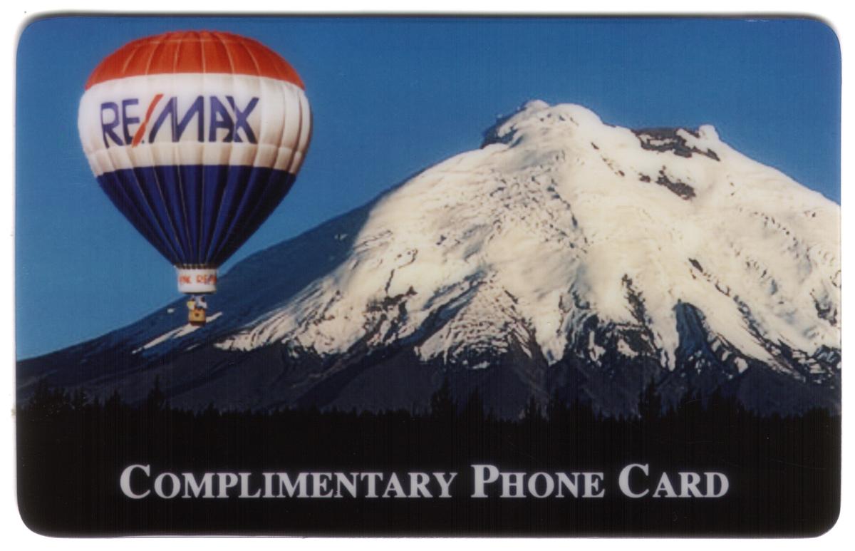 Overall, the card combines the themes of real estate, as represented by the RE/MAX branding, and global communications. The imagery of the hot air balloon and the snow-covered mountains creates a striking visual connection to travel and exploration. The card’s design uses a mix of bright colors and clear photographic elements to convey its promotional and collectible nature.