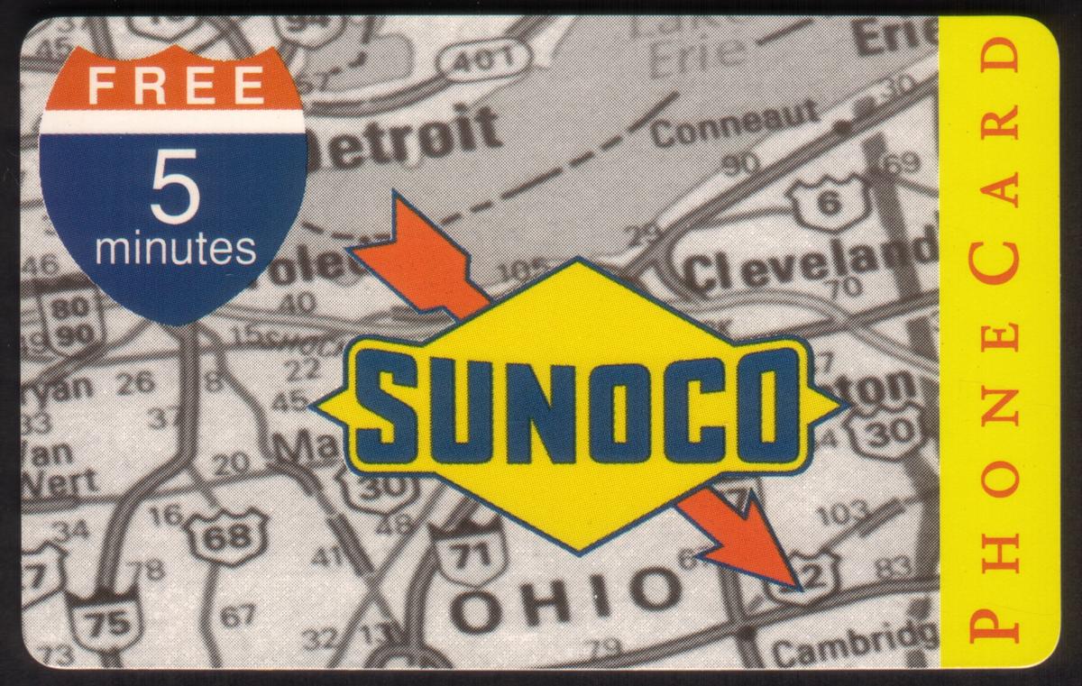 Overall, the card serves as a functional prepaid phone card tied to the Sunoco Oil Company, connecting regional phone usage with broader telecommunications networks. It delivers a clear message about free calling minutes and network accessibility, framed within the context of Sunoco’s regional presence and longstanding brand identity in the energy sector.