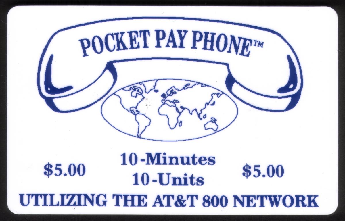 This card is associated with PPI network services and is intended for use with the Pocket Pay Phone system. It offers prepaid calling functionality valued at five dollars, providing ten minutes of outgoing calls on the AT&T 800 network. The design is straightforward without any additional logos or imagery beyond the map and decorative banner.