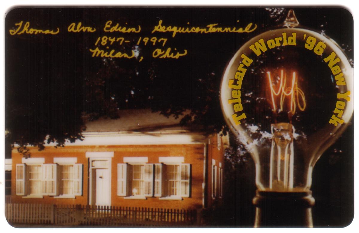 Overall, the card combines historical tribute with the telecard collector’s world through clear, factual details shown on the card’s face, including the light bulb image, event title, location names, year, and corporate branding. These aspects highlight the connection between Thomas Edison’s legacy and the 1996 telecard gathering.