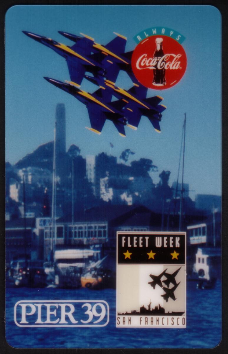 This card commemorates the Navy Fleet Week 1995 event in San Francisco, celebrating the Armed Forces with imagery and logos referencing military aviation and the bustling Pier 39 pier area. The design combines iconic local landmarks with military themes and recognizable corporate branding from Coca-Cola, making it a collectible reflecting this annual event and location.