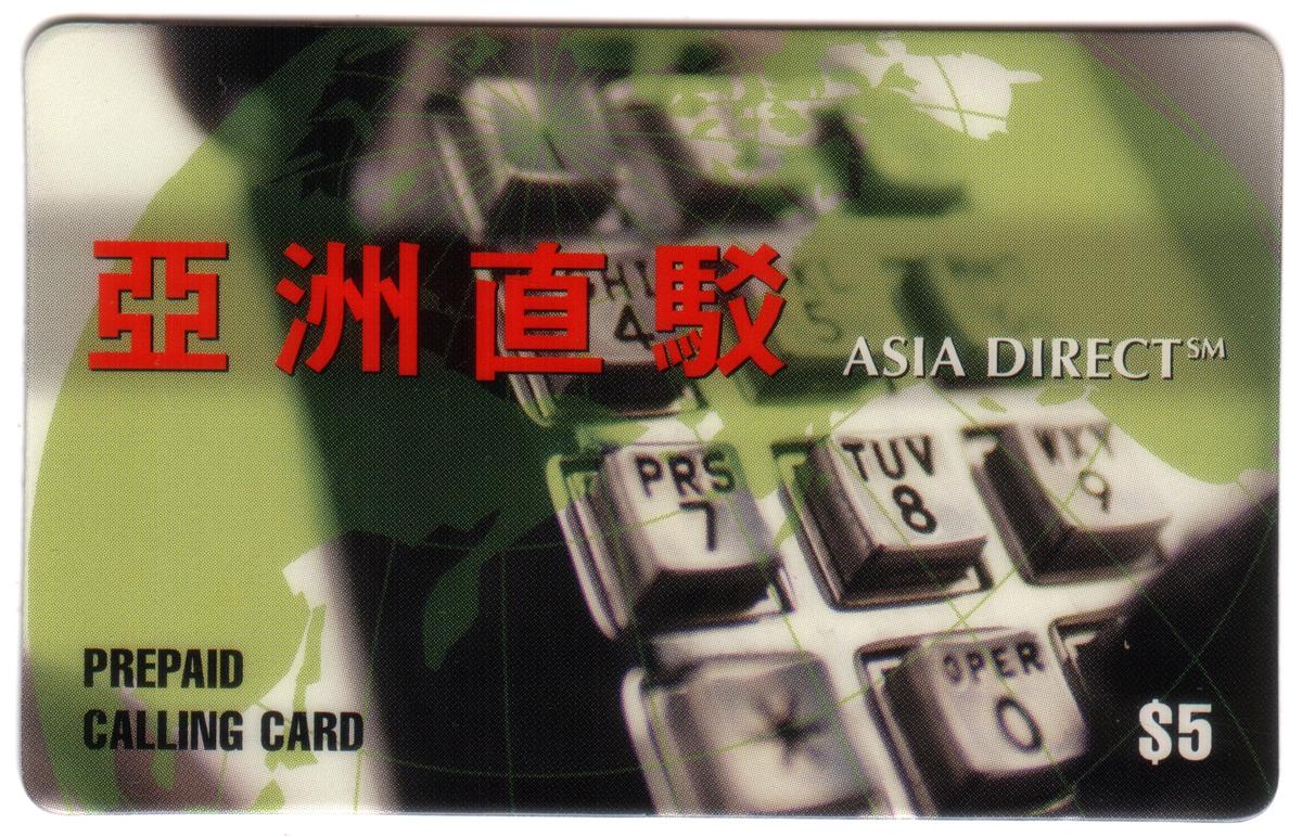 Overall, the card represents a collaboration between Hong Kong Telecom, Asia Direct, and Cable & Wireless, designed for use in telecommunications with a $5 prepaid value. The card’s design serves a clear promotional purpose, associated with the Asian telecommunications market during the mid-1990s.