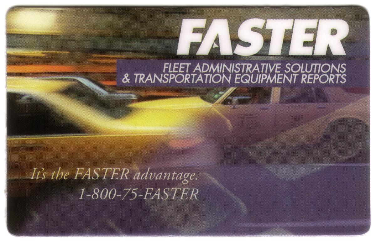 This collectible card features a vivid image centered on the theme of automobiles, emphasizing speed and fleet management. The main visual element is a dynamic red car in motion, surrounded by graphics that convey the idea of fast transportation and efficiency. Prominently displayed on the card are the words "FASTER" and "Fleet Administrative Solutions & Transportation Equipment Reports," highlighting the connection to fleet management services.