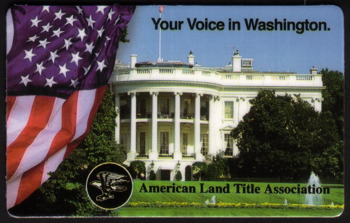 Overall, this collectible card blends national symbolism with a corporate identity, linking the American Land Title Association to Washington, D.C., through the artistry of the White House image, the American flag, and official marks. The combination of these elements reflects a connection to both the nation’s capital and the field of title companies.