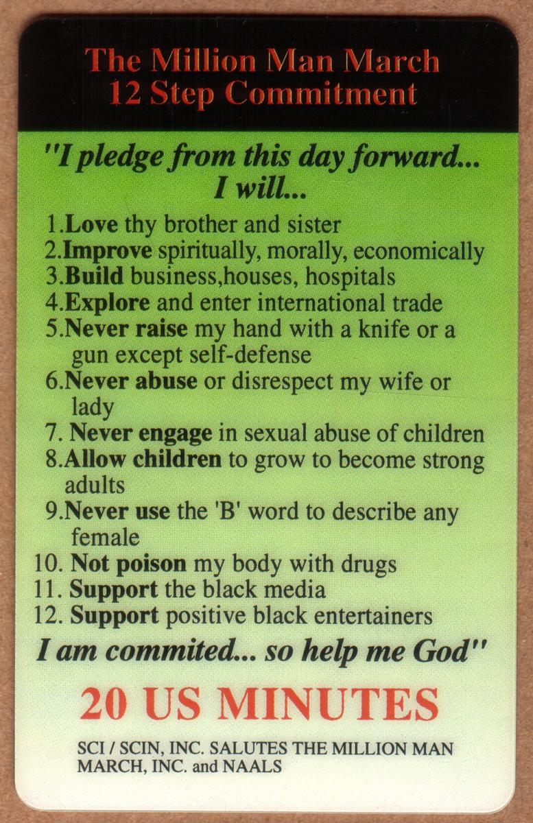 Visible logos include "Statewide Communications" and "ACMI," establishing the card’s telecommunications service context. The card’s aesthetic includes bold text elements displayed clearly on a light-colored background, ensuring the key commitments and branding messages are prominent. The overall impression is of a collectible phone card created to commemorate and promote positive social values linked to the Million Man March and related 12 Step Commitments.