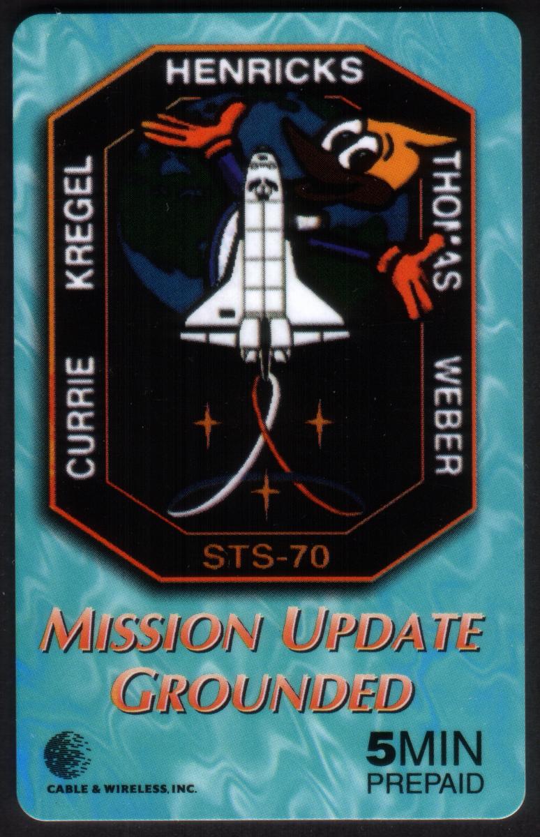 This phone card commemorates the STS-70 mission, with an unusual and specific emphasis on the space shuttle program being grounded due to woodpecker interference, directly referencing the nickname and mascot Woody Woodpecker. The detailed mission patch and crew names make this card a distinctive collectible representing NASA’s shuttle missions and the unique challenges faced during the program.