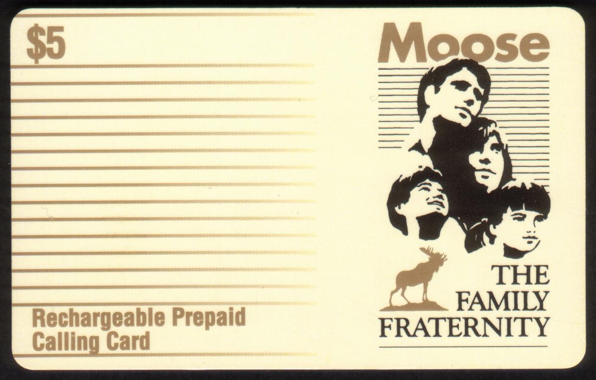 This collectible phone card features the emblem of Moose International, the Loyal Order of Moose, a well-known service organization. The card highlights Moosehaven, known as the City of Contentment, located in Orange Park, Florida, near Jacksonville. The design incorporates references to Mooseheart Child City & School in Chicago, Illinois, emphasizing the Moose fraternity’s family-oriented mission. The card’s layout includes the name "Moose: The Family Fraternity (Mooseheart & Moosehaven)" prominently displayed, linking the organization’s two key community locations.