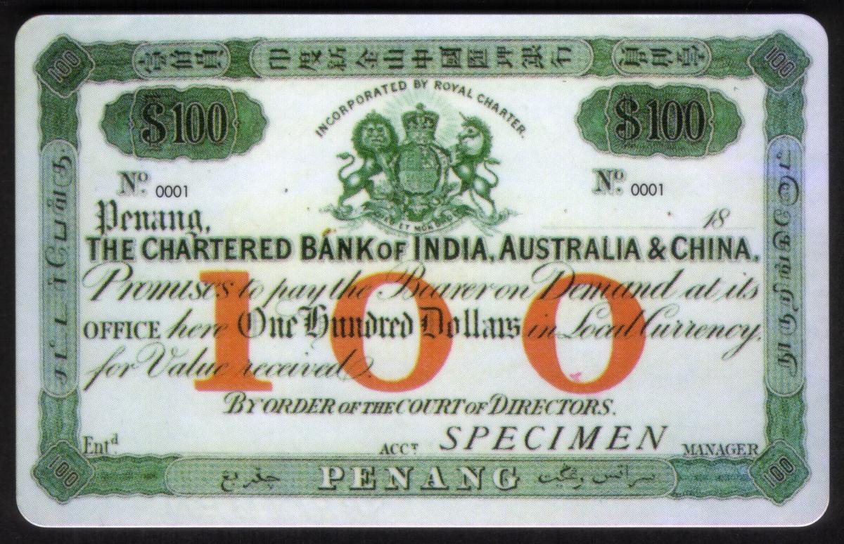 Overall, this stock certificate is a formal financial document representing a $100 share of common stock in Cable & Wireless, issued in Penang, and it features the corporate seal and designated markers identifying it as a specimen document. The certificate is a collectible item tied to the domains of money, stocks, and bonds.