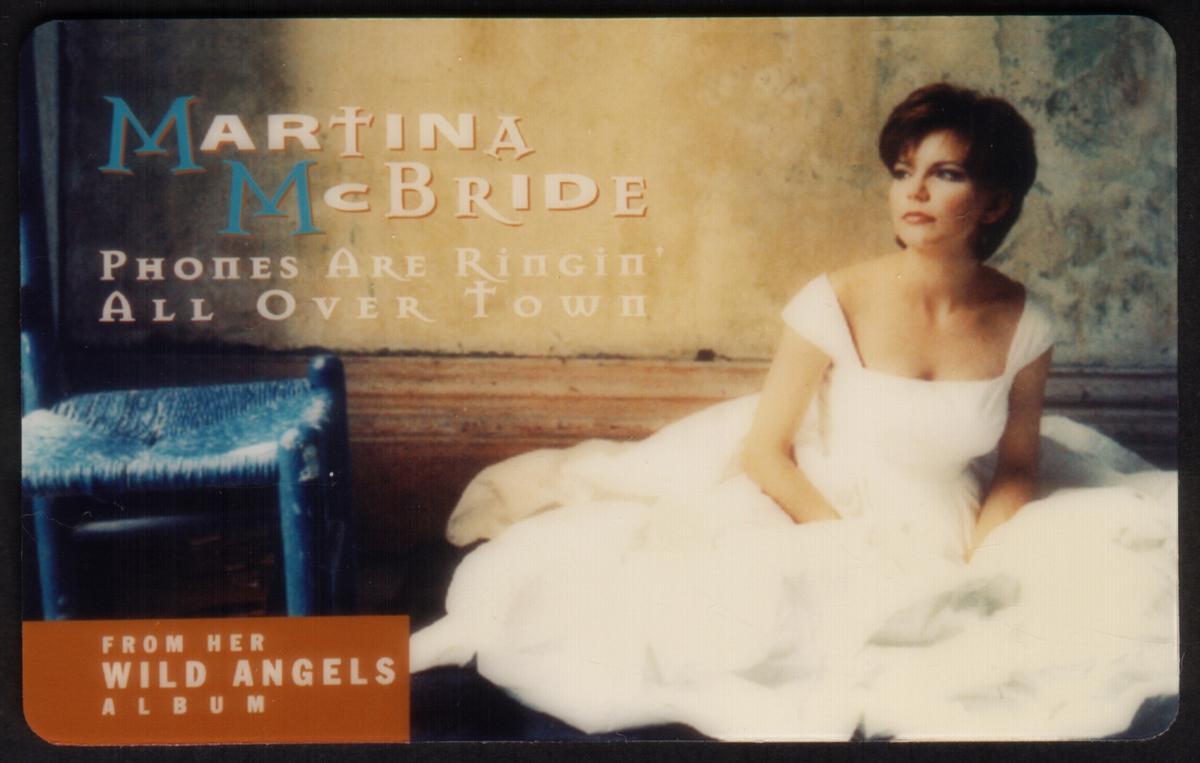 This collectible phone card features a photographic image highlighting the album "Wild Angels" by Martina McBride. The card prominently displays the text "Women 5m" alongside "Martina McBride" and the song title "Phones Are Ringin' All Over Town." The design emphasizes the musical theme related to Martina McBride, a well-known country music singer, connecting the collectible item directly to her work.