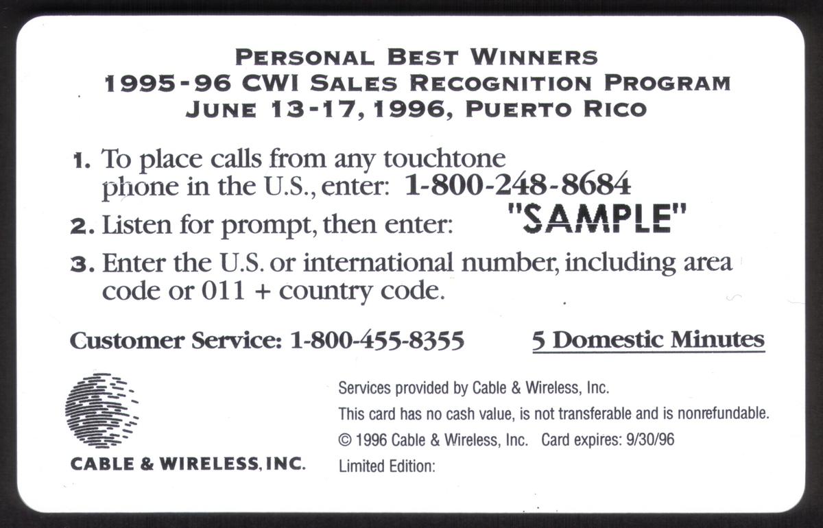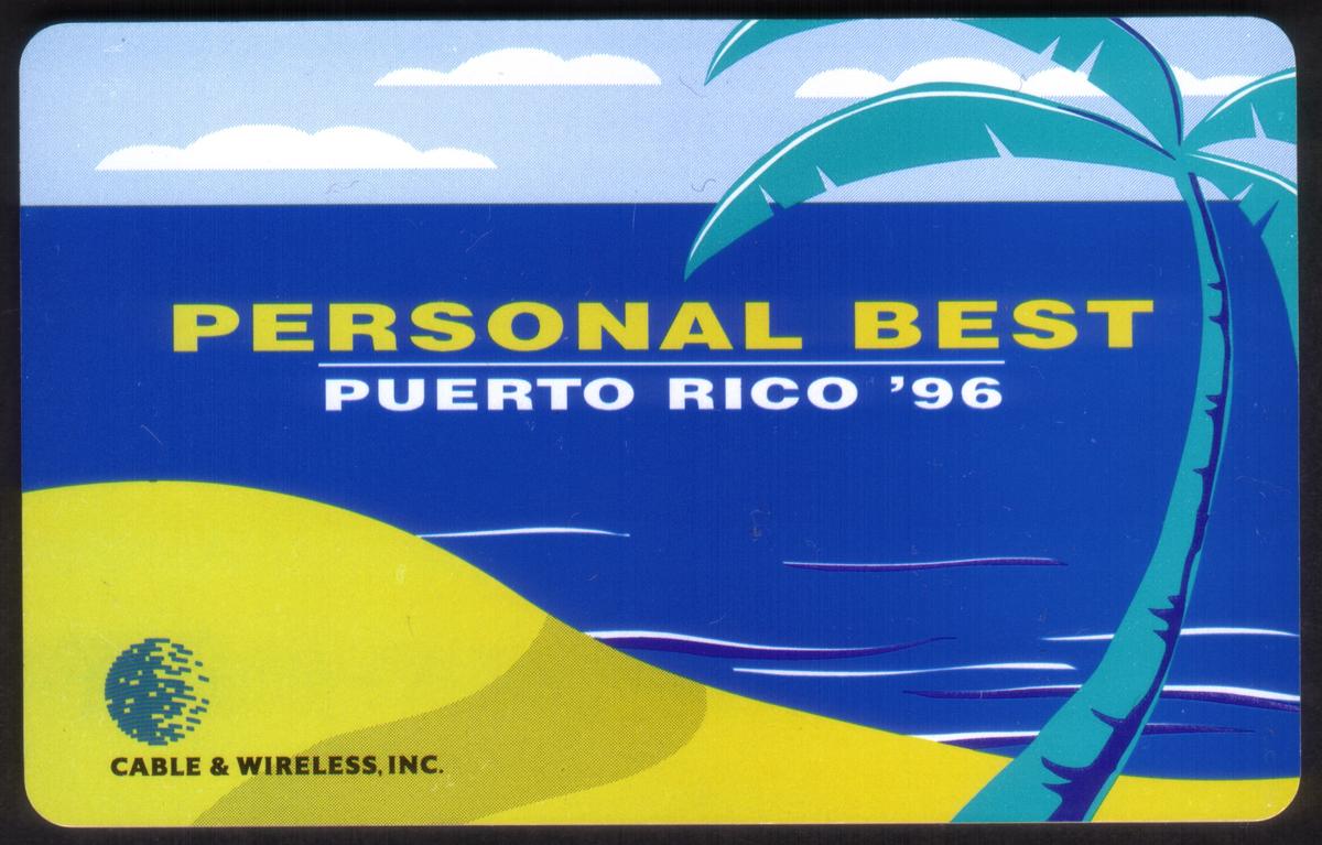 Centered on the card in bold yellow and white lettering is the text: "PERSONAL BEST PUERTO RICO '96." The bottom left corner includes the logo and name "CABLE & WIRELESS, INC." This card commemorates a Cable & Wireless sales recognition event called "Personal Best" held in Puerto Rico in 1996.
