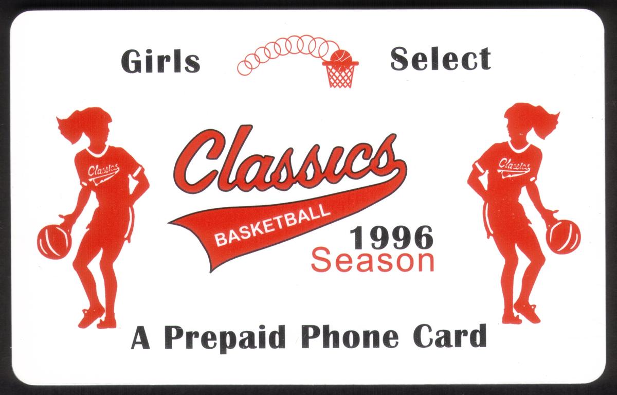 This collectible phone card features the Girls Select Classics Basketball from the 1996 season. The card prominently displays vibrant action artwork related to basketball, highlighting the sport in a dynamic and colorful style. The words "Girls Select Classics Basketball," "1996 Season," and "SPECIMEN" are clearly printed on the card, which emphasizes its collectible specimen status.