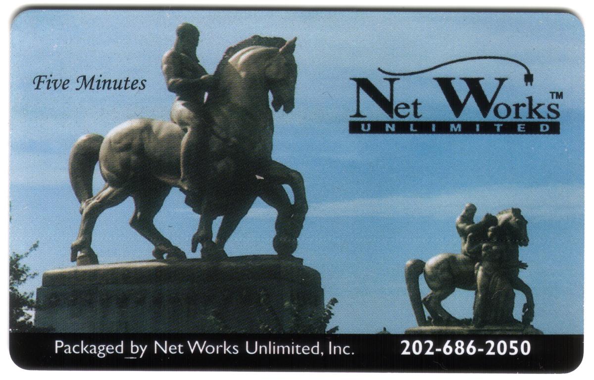 This collectible phone card prominently features the 5-meter-tall Net Works Unlimited Man on Horse Statue located in Washington, DC. The image captures the bronze statue set against a clear background, highlighting the detailed craftsmanship of both the rider and the horse. The statue is depicted from a frontal angle, showcasing the rider seated upright on the horse, embodying a strong sense of motion and presence.