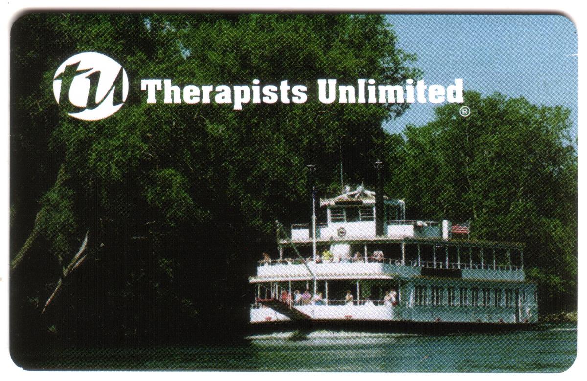 This collectible phone card features a vibrant photographic image of a 10-meter riverboat cruise vessel labeled "Therapists Unlimited" prominently displayed on the side. The boat is depicted sailing on a calm river, surrounded by green trees along the bank under a clear blue sky. The vessel includes multiple decks with passengers visible, showcasing an active and leisurely river cruise setting.