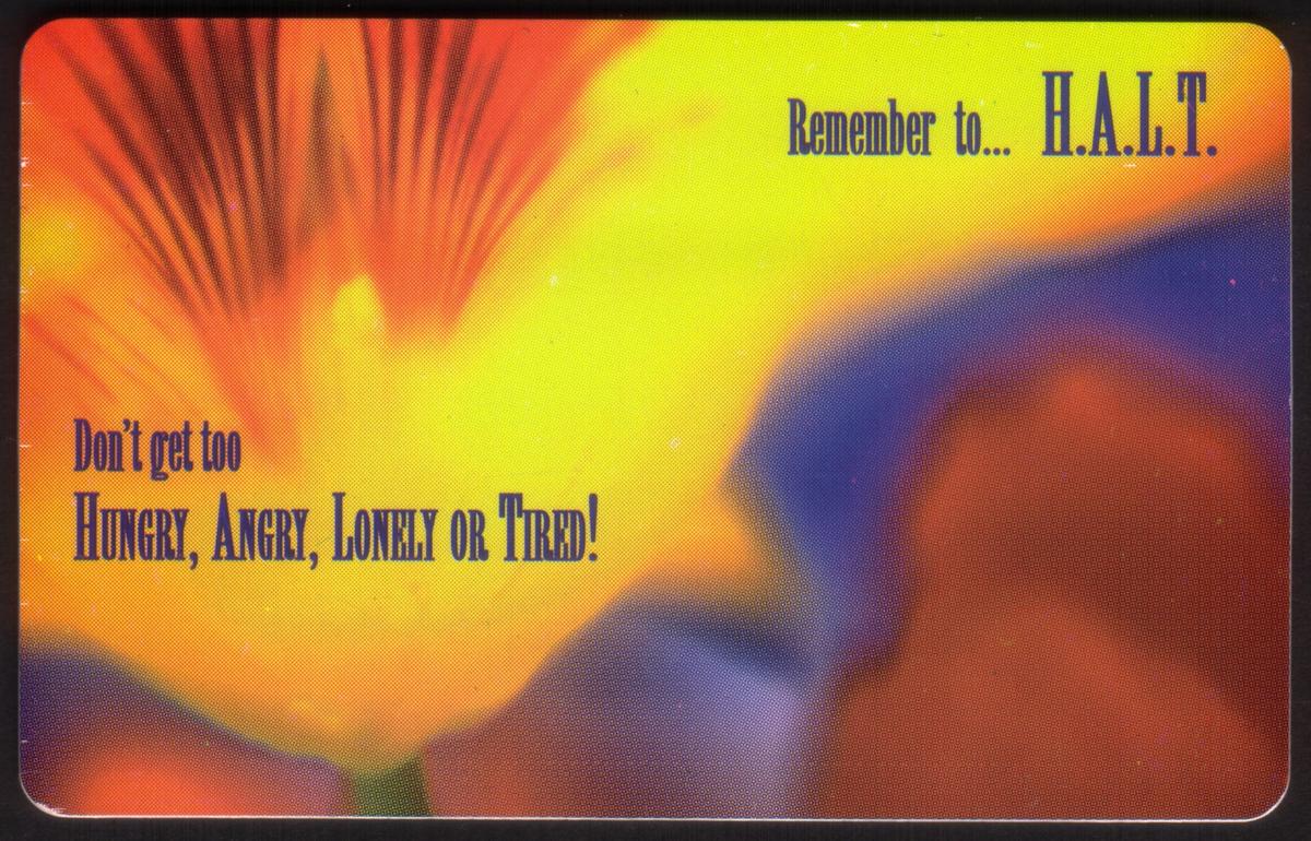 The card displays the additional reminder "Remember To H.A.L.T." which stands for "Don't get too Hungry Angry Lonely or Tired," connecting directly to the theme of emotional and mental wellness. The design includes both the F.E.A.R. acronym and the H.A.L.T. reminder in uppercase letters, making the card visually impactful. The Cable & Wireless (CWI) logo is also presented, indicating the telecommunications company associated with this phone card.