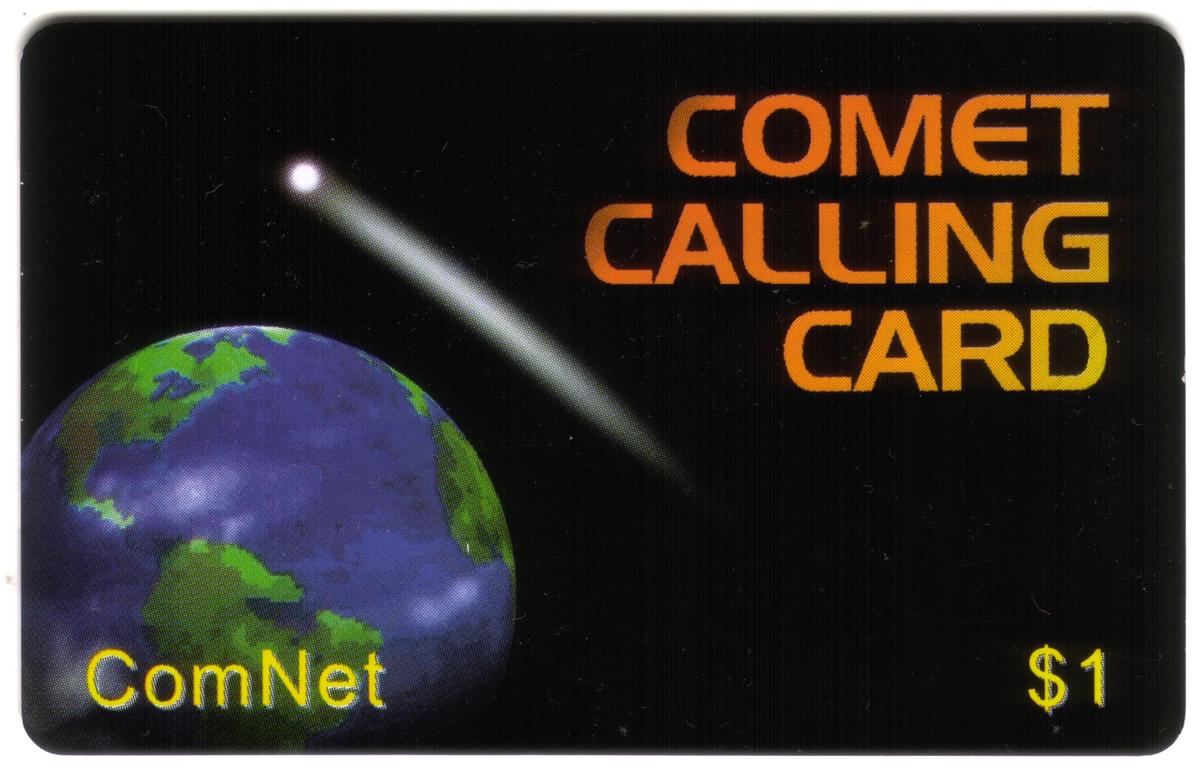 The card is issued by ComNet - Cable & Wireless (CWI) and is identified as a promotional phone card with a $1 value. The text "Comet Calling Card" appears on the card, emphasizing the theme. The overall design uses dark space tones contrasted with bright highlights on the comet and Earth to capture the celestial atmosphere.
