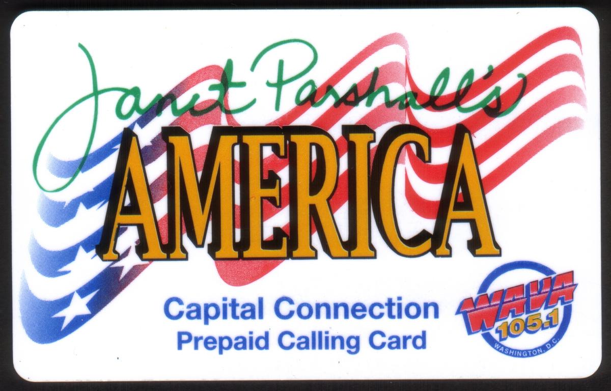Overall, this phone card connects a well-known Washington, D.C. radio station and its specific radio show with the telecommunications service provided by Cable & Wireless International. It is an official sample card designed for promotional or collector purposes, emphasizing the broadcast program hosted by Janet Parshall in the U.S. capital.