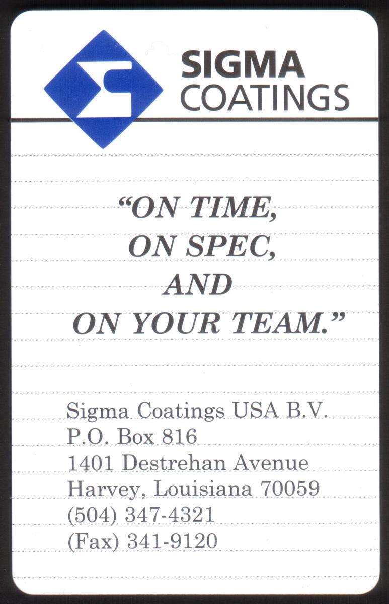 The card provides contact information for Sigma Coatings USA B.V., including a P.O. Box address at 1401 Destrehan Avenue, Harvey, Louisiana, 70059. It lists a phone number, (504) 347-4321, and a fax number, (504) 341-9120.
