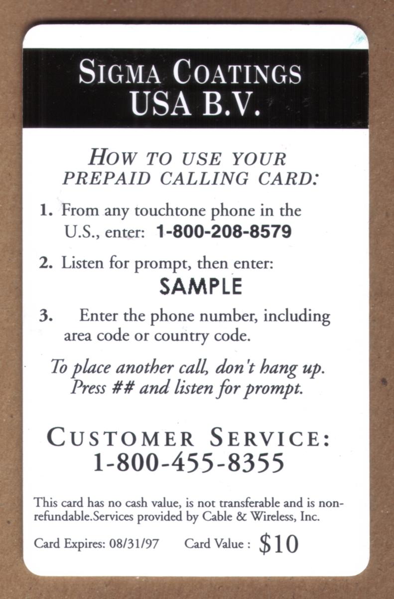 "Cable & Wireless (CWI)" and "SAMPLE" are also associated with this card, indicating a possible use or affiliation. The card is related to Harvey, Louisiana, and the company represents Sigma Coatings operations in that area.