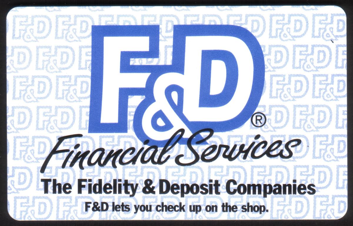 The collectible phone card features the logo and corporate name of F&D Financial Services, also known as The Fidelity & Deposit Companies. The card prominently displays the F&D emblem, accompanied by the text "The Fidelity & Deposit Companies" and "Financial Services," indicating its association with this financial institution. The card also includes the word "SAMPLE," printed visibly on the front.