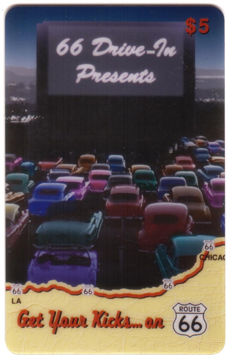This collectible phone card features a classic automobile theme focusing on the $5 Route 66 Drive-In Movie Theater. The image prominently displays a vintage car driving on an open road under a broad daylight sky, embodying Americana and transportation culture. The design highlights the nostalgic appeal of classic cars and the historic Route 66, a famed American highway known for its significance in driving and automotive history.