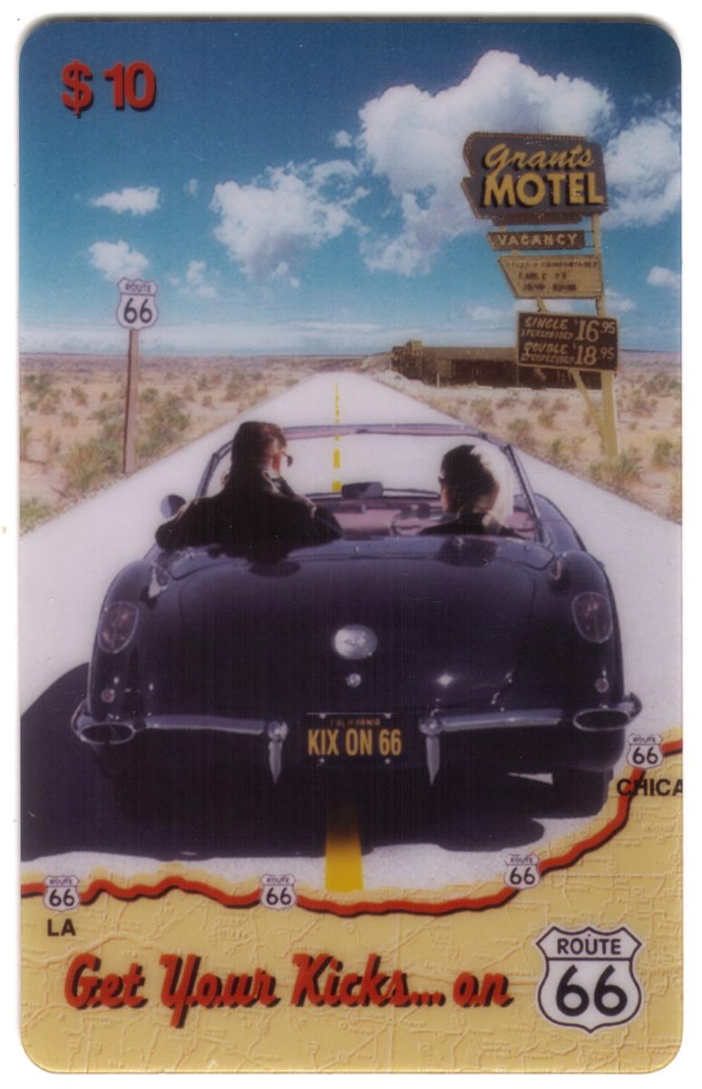 The card highlights transportation and driving nostalgia with the convertible’s top down, showcasing detailed reflections and chrome accents, capturing a sunny, clear day under a blue sky. The card’s lower portion includes text that reads “Kix on 66,” referencing the cultural and historical significance of Route 66. In addition, the card bears the identification of “Benchmarc Communications and Marketing,” as well as the reference to “LDDS WorldCom” printed along the bottom edge.